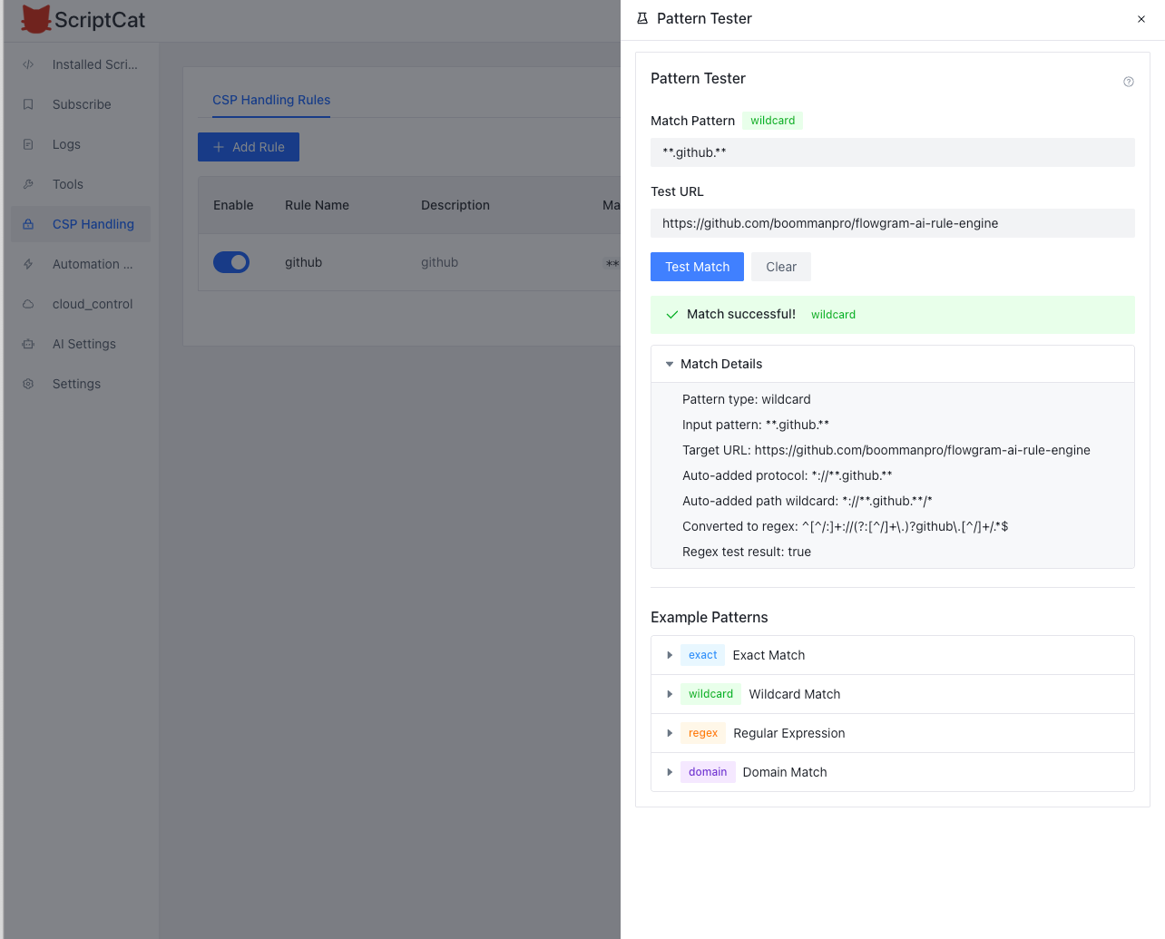 优化并修复当前CSP模块中规则无法正确匹配所有路径的问题,确保其规则功能与 https://wproxy.org/docs/rules/pattern.html 保持一致。具体实施要求如下: