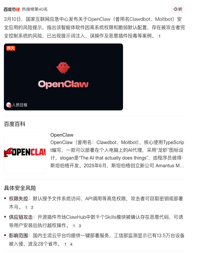 3月10日,国家互联网应急中心发布关于OpenClaw(曾用名Clawdbot、Moltbot)安全应用的风险提示,指出该智能体软件因高系统权限和脆弱默认配置,存在被攻击者完全控制系统的风险,已出现提示词注入、误操作及恶意插件投毒等案例。