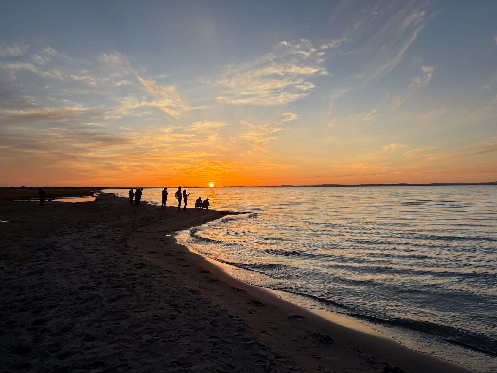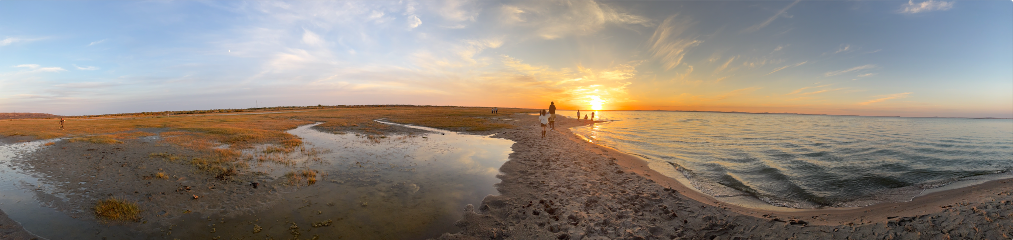 There is a huge lake, and the sky looks yellow. It's very beautiful.